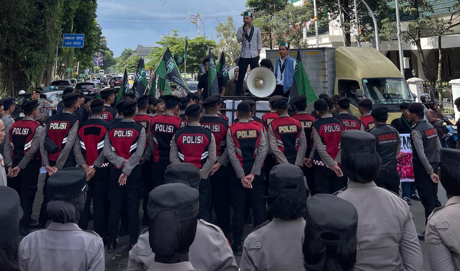 Ketua Umum HMI Cabang Kota Bogor, Moeltazam, dalam orasinya mengkritik sikap pemerintah yang dinilai terlalu lunak bahkan cenderung membisu di tengah memanasnya konflik global.