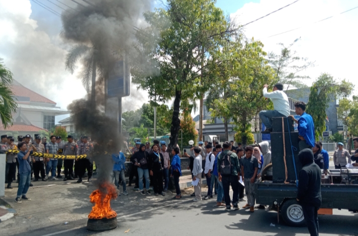 Massa sempat membakar ban di depan kantor sebagai bentuk protes, menyebabkan asap hitam membumbung dan menarik perhatian pengguna jalan.