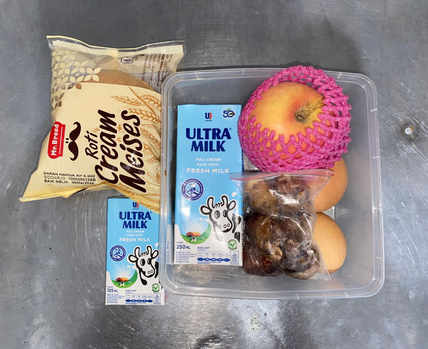Dalam kegiatan pembagian kali ini, paket makanan yang disalurkan terdiri dari roti sebagai sumber energi, enam buah kurma yang kaya serat dan mineral, buah apel yang mengandung vitamin dan antioksidan, susu Indomilk ukuran 250 ml dan 115 ml sebagai sumber protein dan kalsium, serta dua butir telur rebus yang mengandung protein berkualitas tinggi.